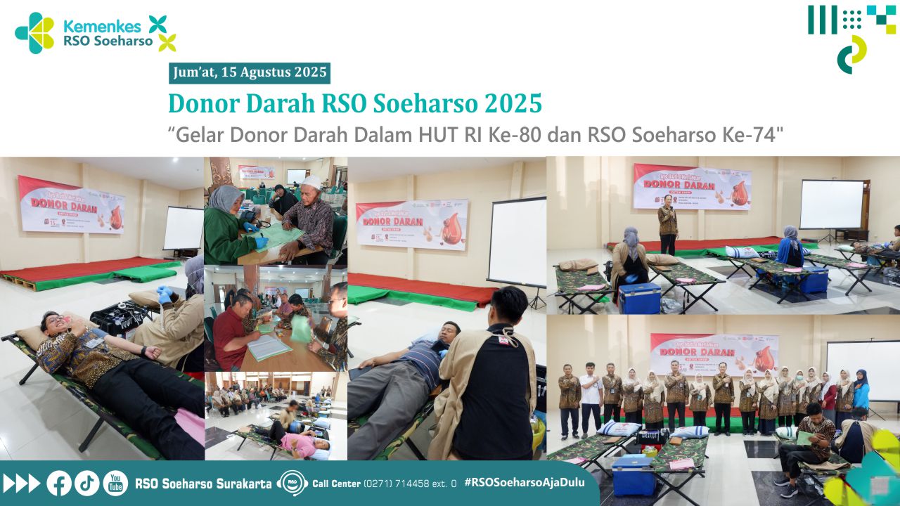 Sukoharjo [15/08/2025] – Dalam rangka menyambut HUT RI Ke-80, HUT RSO Soeharso Surakarta Ke-74 dan HUT HKN Ke-61, Instalasi Laboratorium RSO Soeharso Surakarta bekerjsama dengan Palang Merah Indonesia (PMI) Kabupaten Sukoharjo pada hari, Jum’at tanggal 15 Agustus 2025 pukul 08.00 WIB s.d selesai menyelenggarakan donor darah di Gedung Joglo-RSO. Sejumlah 175 relawan pendonor hadir berbagi kebaikan untuk sesama diwaktu yang tepat dan baik. Kegiatan donor darah dibuka oleh Direktur Utama Dr. dr. Romaniyanto, Sp.OT(K), Spine, MARS, dan mengajak para pedonor dari pegawai RSO Soeharso khususnya serta masyarakat umum untuk berbagi kebaikan di hari Jum’at yang baik ini. Kami mengucapkan terima kasih kepada semua pendonor dari pegawai dan masyarkat umum dalam memeriahkan dan berpartisipasi kegiatan ini. Semoga kegiatan ini menjadikan saudara-saudara kita terbantu dari setetes darah yang didonorkan dan tetap sehat bagi para pendonor, ucap beliau. Hadir juga para direksi dan panitia kegiatan HUT RSO Soeharso serta para peserta relawan.