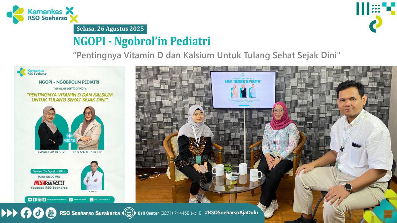 Sukoharjo [Studio RSO] – Sejak masa kanak-kanak hingga remaja, tulang mengalami proses pertumbuhan dan pembentukan massa tulang yang optimal. Inilah masa emas untuk membangun fondasi tulang yang kuat. Dua zat gizi yang sangat berperan penting adalah kalsium dan vitamin D. Ngopi (Ngobrol’in Pediatri) hadir Kembali dengan tema “Pentingnya Vitamin D dan Kalsium Untuk Tulang Sehat Sejak Dini”.dan menghadirkan narasumber Nor Azizah, S.Tr.,Ftr. Hasri Ndaru Kusumawati, S.Gz, dengan moderator dr. Setiadi, Sp.OT.