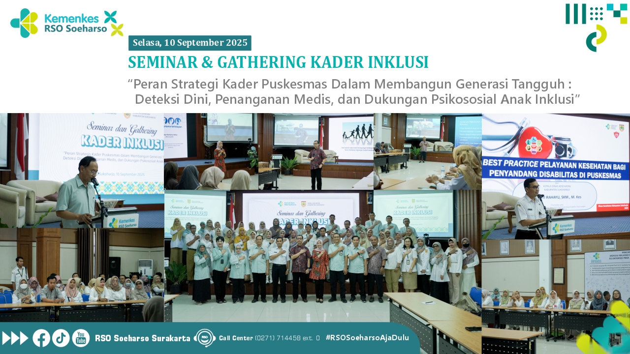 Sukoharjo [R.Auditorium Lt.3] – Seminar & Gathering Kader Inklusi diselenggarakan di Ruang Auditorium Lt.3 Gedung Perkantoran oleh Tim Kerja Hukum dan Humas RSO Soeharso Surakarta untuk kader-kader inklusi di Kabupaten Sukoharjo dan beberapa kader puskesmas diwilayah Surakarta . Tema yang diusung “Peran Startegi Kader Puskesmas Dalam Membangun Generasi Tangguh : Deteksi Dini, Penanganan Medik dan Dukungan Psikososial Anak Inklusi”, dengan peserta kader inklusi di Kabupaten Sukoharjo. Kader inklusi adalah agen perubahan di masyarakat yang berperan memperjuangkan kesetaraan hak dan partisipasi semua orang tanpa diskriminasi.