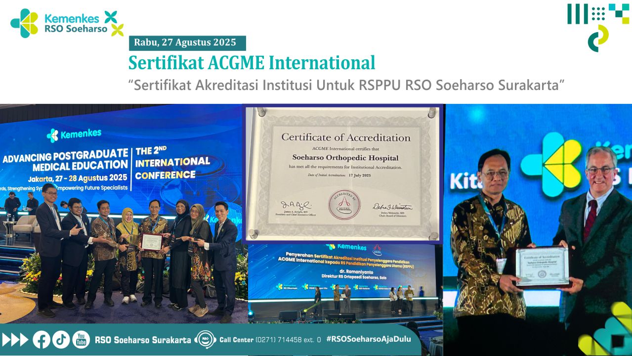 Jakarta – [Hotel Raffles Jakarta, 27-28 Agustus 2025]  – Konferensi Internasional ke-2 tentang Kemajuan Pendidikan Kedokteran Pascasarjana (PGME) “Menyesuaikan Standar, Memperkuat Sistem, Memberdayakan Spesialis Masa Depan” yang diselenggaran di Jakarta pada tanggal 27-28 Agustus 2025. RSO Soeharso mendapatkan Sertifikat Akreditasi Institusi penyelenggara dari ACGME Internasional untuk RSPPU (Rumah Sakit Pendidikan Penyelenggara Utama).