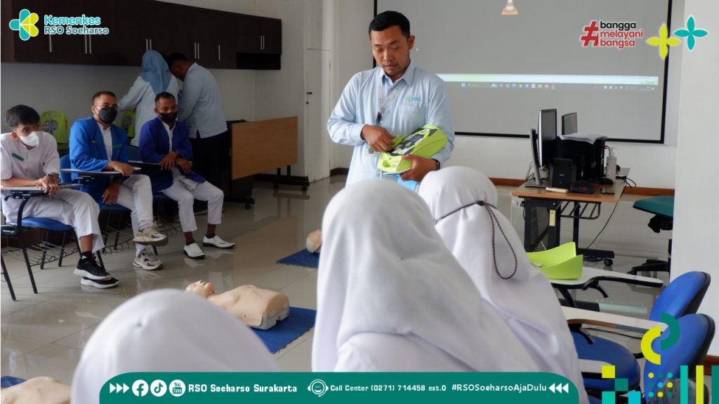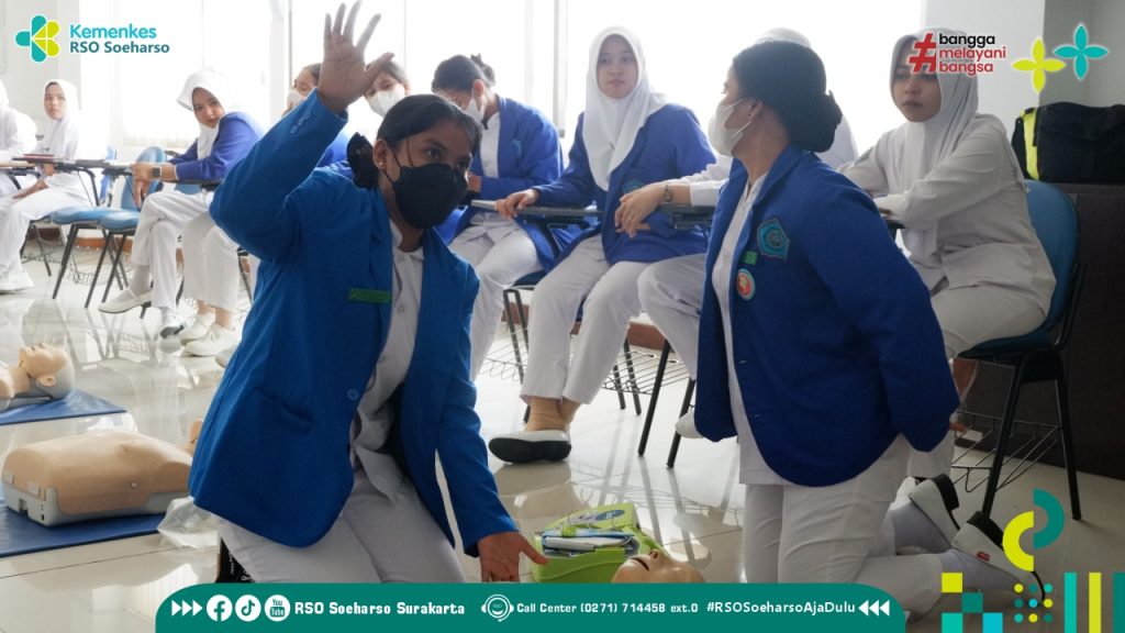 Surakarta (01/12) – RSO Soeharso Surakarta adakan Workshop BLS Batch 15 untuk Mahasiswa/wi STIKes Tujuh Belas Karanganyar di Ruang Workshop Lantai 3 Gedung Perkantoran. Workshop Basic Life Support For Healthcare Providers Batch 15 yang diikuti 36 mahasiswa/wi dari STIKes Tujuh Belas Karanganyar dan 4 perawat RSO Soeharso Surakarta. Sebagai narasumber dr. Kshanti Adhitya, Sp.EM, MM, dr. Hafid Septian Nugroho, Sukini, S.Kep, Ners, Adi Fitrianto, AMK, Kartika Ekawati, S.Kep., Ns dan Nanda Wardhana, A.Md.Kep.