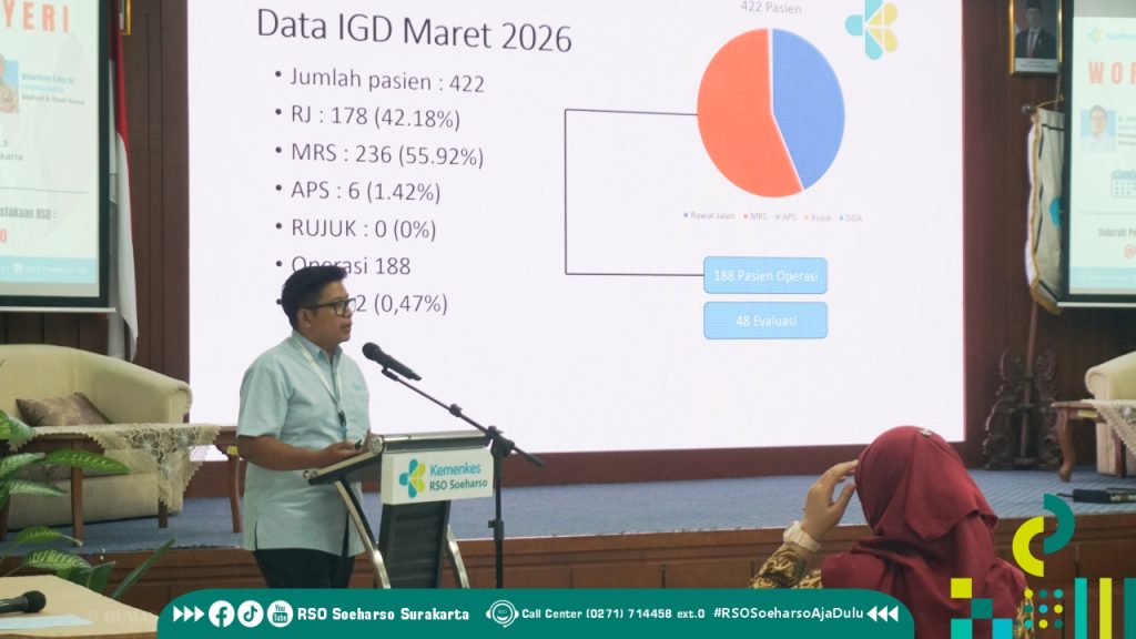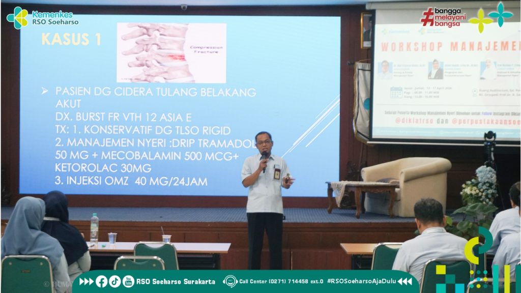 SURAKARTA – Manajer Pendidikan Dan Pelatihan RSO Soeharso Surakarta menyelenggarakan workshop untuk peningkatan mutu dan kompentensi para tenaga medis dengan Tema “Workshop Manajemen Nyeri” yang berlangsung selama 5 (lima) hari, 13 – 17 April 2026 di ruangan Auditorium Lantai 3 Gedung Perkantoran. Sebagai narasumber dr. Sigit Prasetya Utama, Sp.An, Dhiani Budiati,