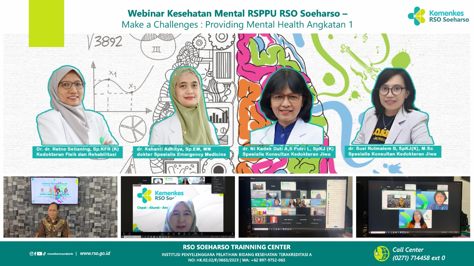 Sukoharjo – Dalam rangkaian kegiatan memperingati HUT RSO Soeharso ke-74, serta meningkatkan kesadaran, pemahaman dan ketrampilan petugas medis maupun non medis dalam menjaga, meningkatkan kesehatan jiwa di lingkungan RSPPU berdasarkan prinsip – prinsip ACGME-I,  Soeharso Training Center menyelenggarakan Webinar Kesehatan Mental RSPPU RSO Soeharso – Make a Challenges : Providing Mental Health Angkatan 1. Kegiatan ini berlangsung pada hari Jumat, tanggal 12 September 2025 pukul : 07.30 – 11.00 WIB yang diikuti oleh 150 peserta zoom meeting serta disaksikan lebih dari 400 pemirsa live youtube melalui link : https://www.youtube.com/live/gF9O5wt2kF8 .